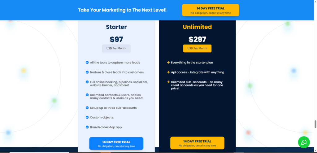 Never buy blind. GoHighLevel offers a 14-day free trial. This gives you two weeks to set up your agency snapshot and perhaps even land your first client before the first bill hits.
