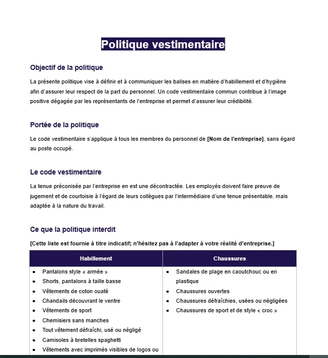 Bien sûr ! Tous nos modèles sont facilement personnalisables. Vous pouvez les modifier selon vos besoins spécifiques, que ce soit en ajoutant le logo de votre entreprise ou en modifiant certains textes pour les adapter à vos politiques internes